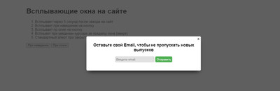 Код <div class="kanulon_lasub" style="display: none;"> <h3>Оставьте свой Email, чтобы не пропускать новых выпусков</h3> <form> <input type="email" placeholder="Введите email" name="email-popup"> <input type="button" name="btn-form-popup" value="Отправить"> </form> <span>×</span> </div> <div class="sekadelva" style="display: none;"></div> <div class="vedelsamun"> <h1>Просмотр данного окна</h1> <ol> <li>Появится через пять секунд, как вы откроете страницу</li> <li>Также при клике на предмет или ссылки</li> <li>Появление при клике на кнопку</li> <li>Как только клик покинет браузером окно, то появится всплывающее</li> <li>Закрытие окна стандартное, через клике</li> </ol> <button class="open-modal">Срабатывает при наведение</button> <button class="open-modal2">Срабатывает при клике кнопки или ссылки</button> </div>