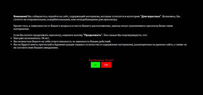 Код <div id="warning-win"> <div class="cover-warning"></div> <div class="win-warning-content container-modal-warning"> <p align="left"><b>Внимание!</b> Вы собираетесь перейти на сайт, содержащий материалы, которые относятся к категории "<b>Для взрослых</b>". Возможно, Вы сочтете их откровенными, оскорбительными, или неподобающими для просмотра.<br><br>Кроме того, в зависимости от Вашего возраста и места Вашего расположения, законы могут ограничивать просмотр Вами таких материалов.<br><br>Если Вы хотите продолжить просмотр, нажмите кнопку "<b>Продолжить</b>". Тем самым Вы подтверждаете, что:<ul class="uz"><li><p align="left"> Вам уже исполнилось 18 лет.</p></li><li><p align="left"> Вы полностью берете на себя ответственность за законность Ваших действий.</p></li><li> <p align="left">Вы не будете иметь претензий к Администрации сервиса за качество и содержание материалов, размещенных на данном сайте, а также за их соответствие Вашим ожиданиям.</p></li></ul></p> <br><br><br><span>Вам больше 18 лет?</span><br> <button id="b_yes">Да</button> <button id="b_no"><a href="/">Нет</a></button> <p class="text-warning" style="visibility: hidden;">Пора смотреть мультики!</p> </div> </div>