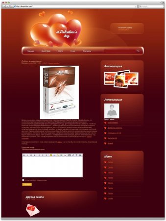 Шаблон: Блоговые / Красные / dle 9.4 Название: Valentine Версия DLE: 9.4+ Кроссбраузерность: Safari, IE 7+, Opera, Firefox, Chrome