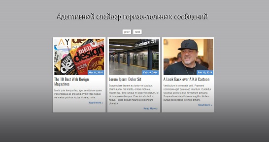 Простой и легкий по функциональности адаптивный слайдер, который идет в горизонтальном виде, где отлично подойдет под новости на вашем сайте. Где основные переключатели слайда у него расположены по вверх, что отличает его от других. Вы можете по умолчанию выставить несколько изображение, а другие будут скрыты. Где при перемотке станут появляться по одной картинки, что ровняется одной новостной информации.